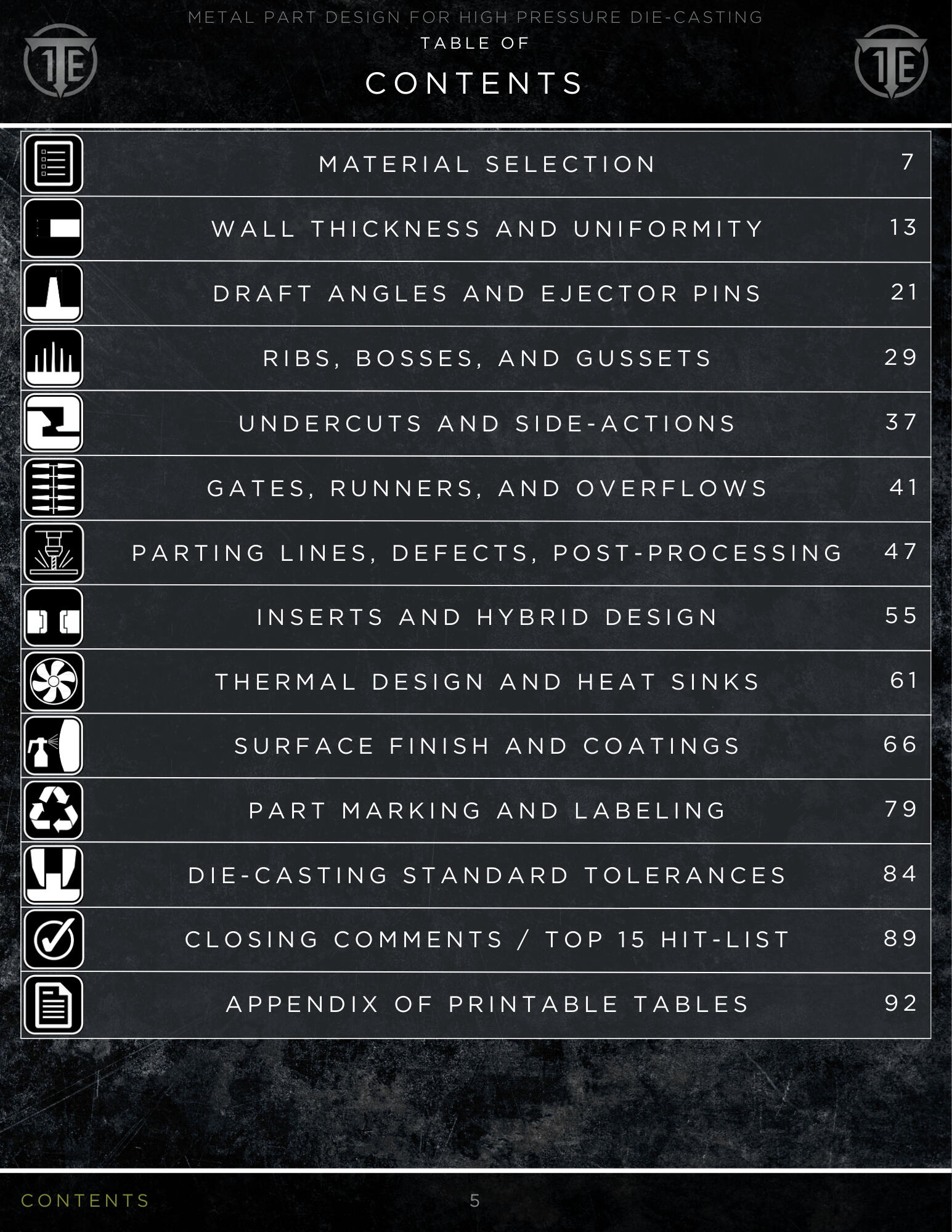 Battle-tested die-cast part design rules from a lifetime of experience designing for high-volume, high-criticality products across the automotive and defense sectors. 117 pages of practical tables and ratios for materials, walls, ribs, finishes, tolerances, and more: the KISS approach that eliminates rework and delivers first-shot approval.No theory overload: just what works, and why.PDF Format - Lifetime updates. Instant download.