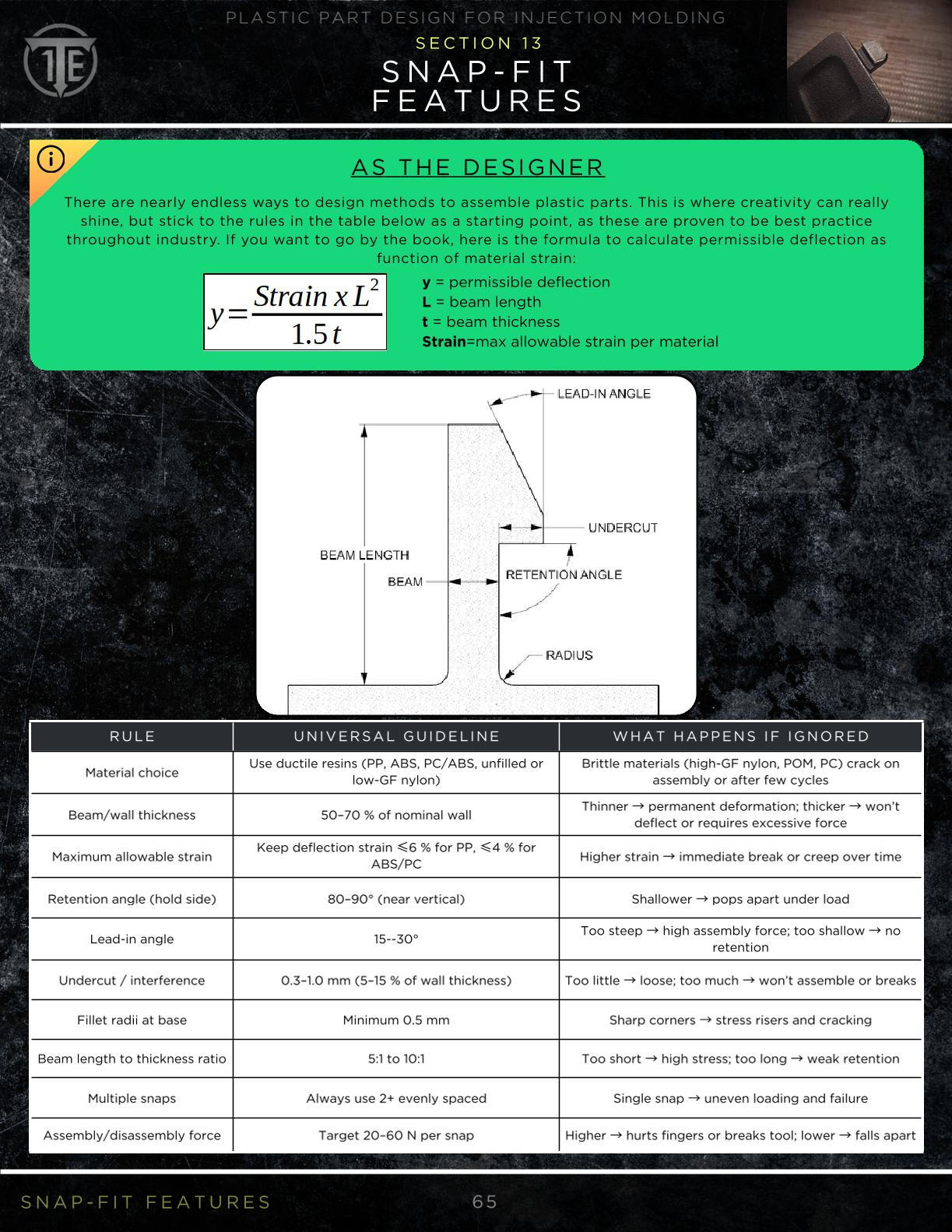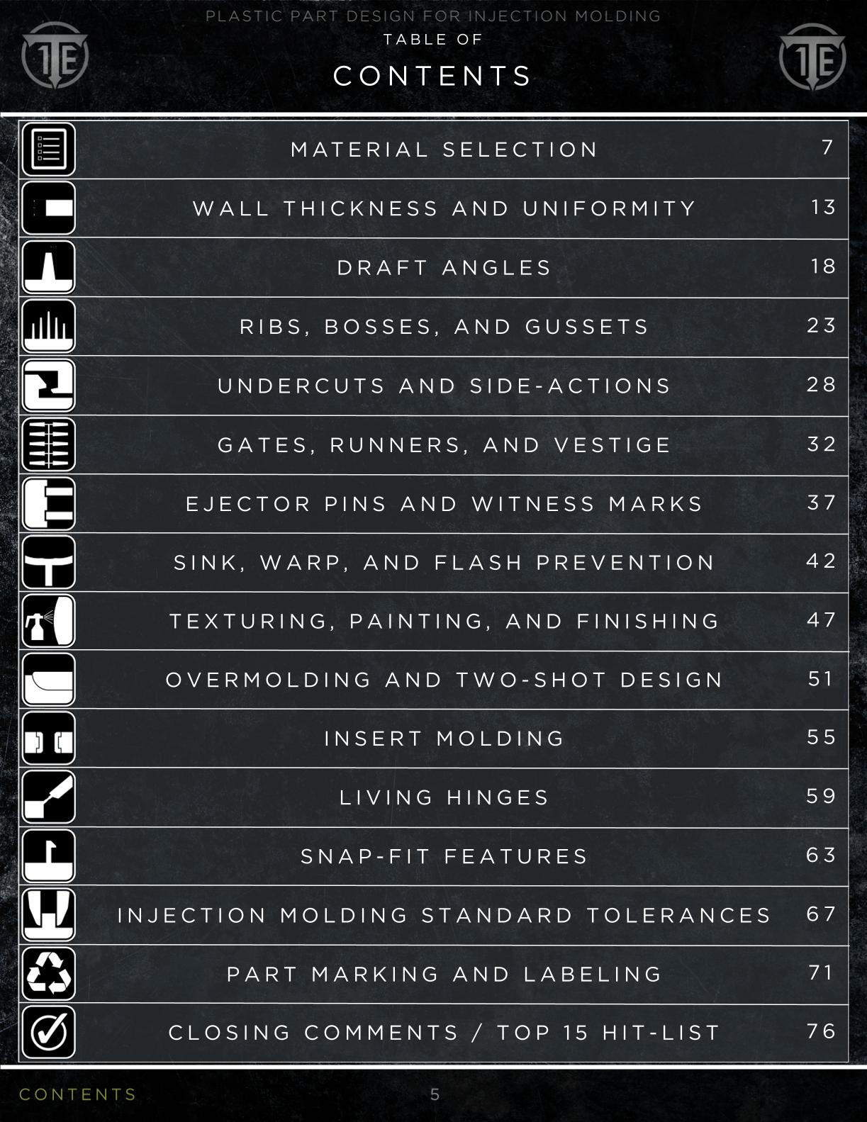 Battle-tested plastic part design rules from a lifetime of experience designing for high-volume, high-criticality products across the automotive and defense sectors. 99 pages of practical tables and ratios for walls, ribs, snaps, tolerances, and more; the KISS approach that eliminates rework and delivers first-shot approval.No theory overload: just what works, and why.PDF Format. Lifetime updates. Instant download.
