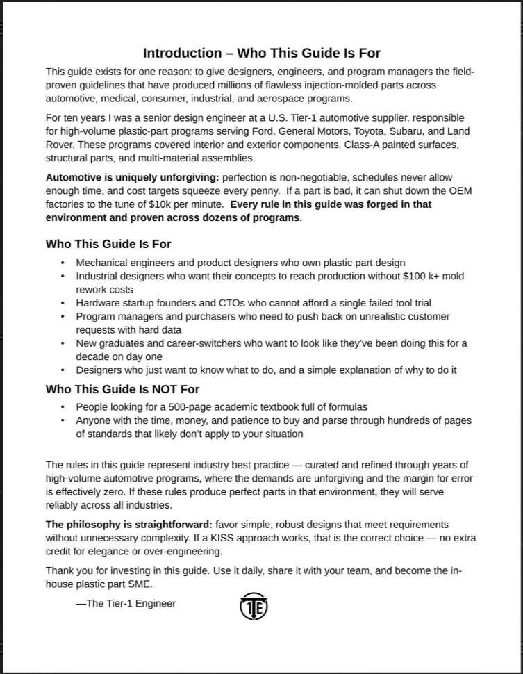 The Tier-1 Engineer is a former senior design engineer with over a decade of experience at a U.S. Tier-1 automotive supplier, owning high-volume factory and accessory programs for Ford, General Motors, Toyota, Subaru, and Land Rover. These programs spanned plastic injection molding, die casting, stamping, extruded components, CNC machining, fasteners, etc. — from Class-A exteriors to structural assemblies — under the relentless demands of automotive manufacturing, where precision is non-negotiable and errors are costly, to the tune of $15K per minute if your part shuts down the assembly lines.That experience forged a simple philosophy: favor robust, straightforward designs that meet requirements reliably and affordably. Complexity earns no reward — if a KISS approach works, that is the correct choice.The Tier-1 Playbook series distills those hard-won lessons into concise, practical guides. Each volume is 60 pages of tables, ratios, and rules with clear explanations — no academic theory, just what delivers first-shot success.The motivation is straightforward: help designers, engineers, founders, and teams avoid the expensive mistakes I saw (and fixed) too many times. These rules were tested in one of the toughest manufacturing environments, and survived — they will serve reliably in any application.